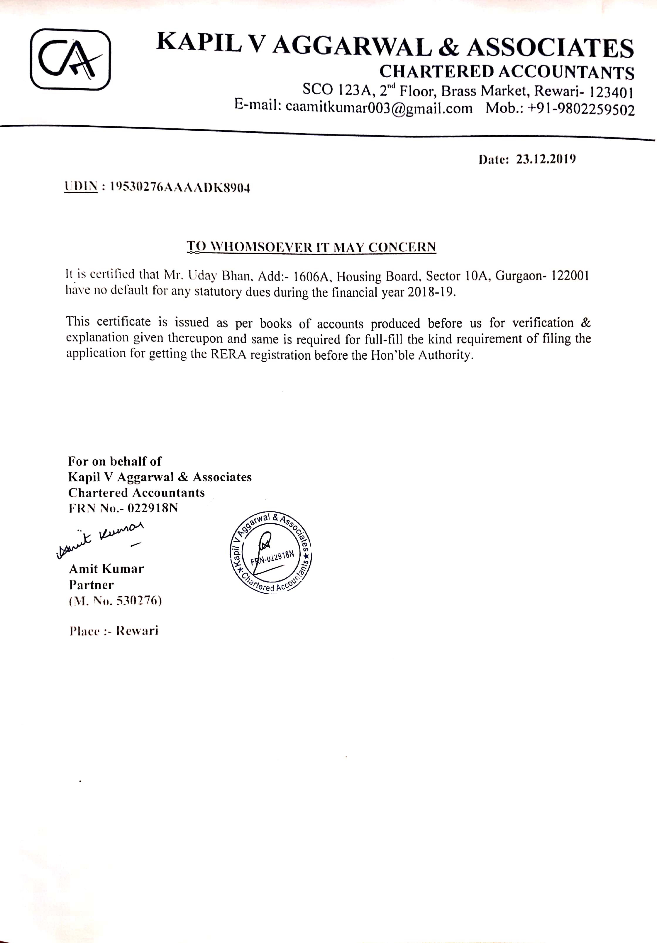 NON DEFAULT CERTIFICATE FROM A CHARTERED ACCOUNTANT |