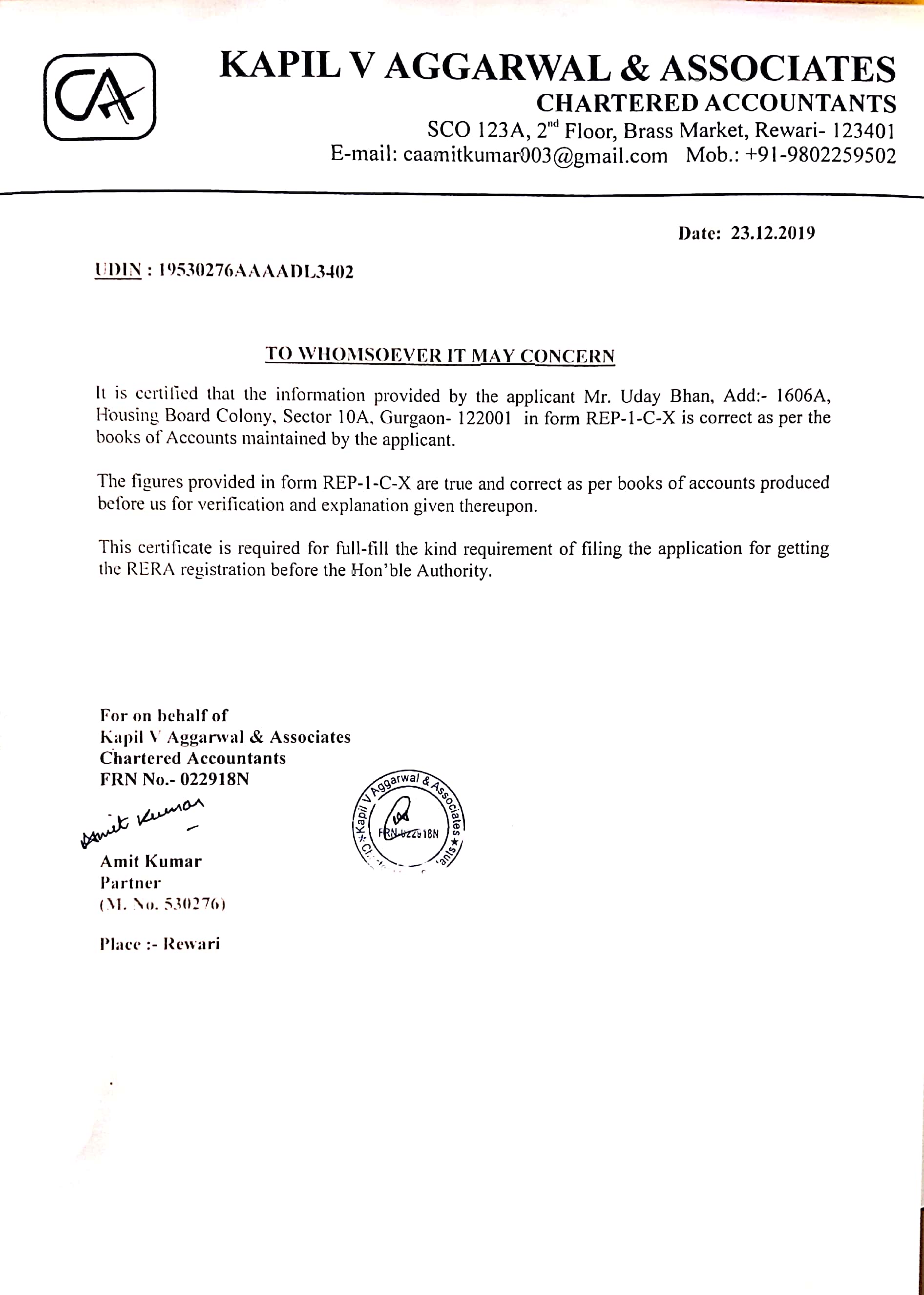 CERTIFICATE FROM A CHARTERED ACCOUNTANT CERTIFYING THAT THE INFORMSTION PROVIDED BY THE APPLICANT IN FORM REP-1-C-X IS CORRECT AS PER THE BOOKS OF ACCOUNTS/ BALANCE SHEET OF THE APPLICANT |