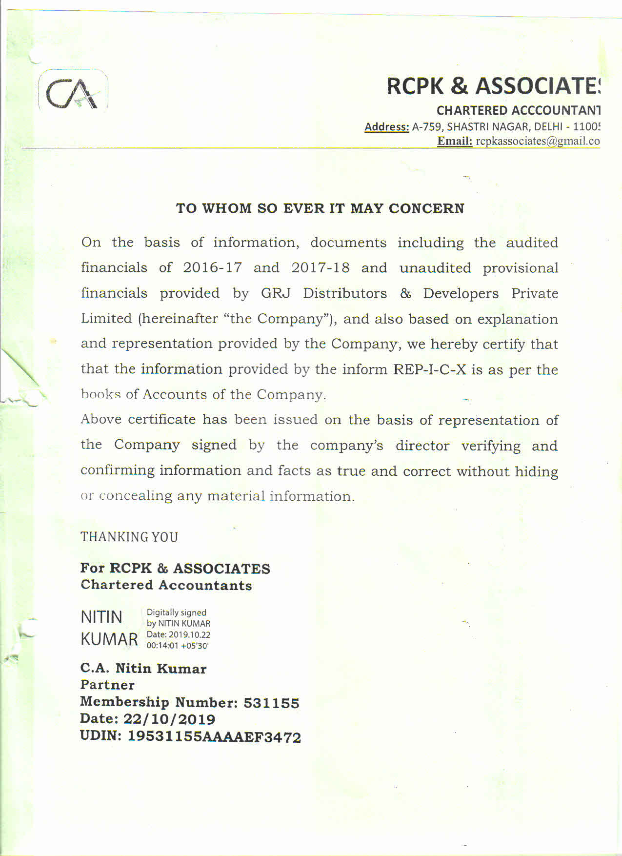 CERTIFICATE FROM A CHARTERED ACCOUNTANT CERTIFYING THAT THE INFORMSTION PROVIDED BY THE APPLICANT IN FORM REP-1-C-X IS CORRECT AS PER THE BOOKS OF ACCOUNTS/ BALANCE SHEET OF THE APPLICANT