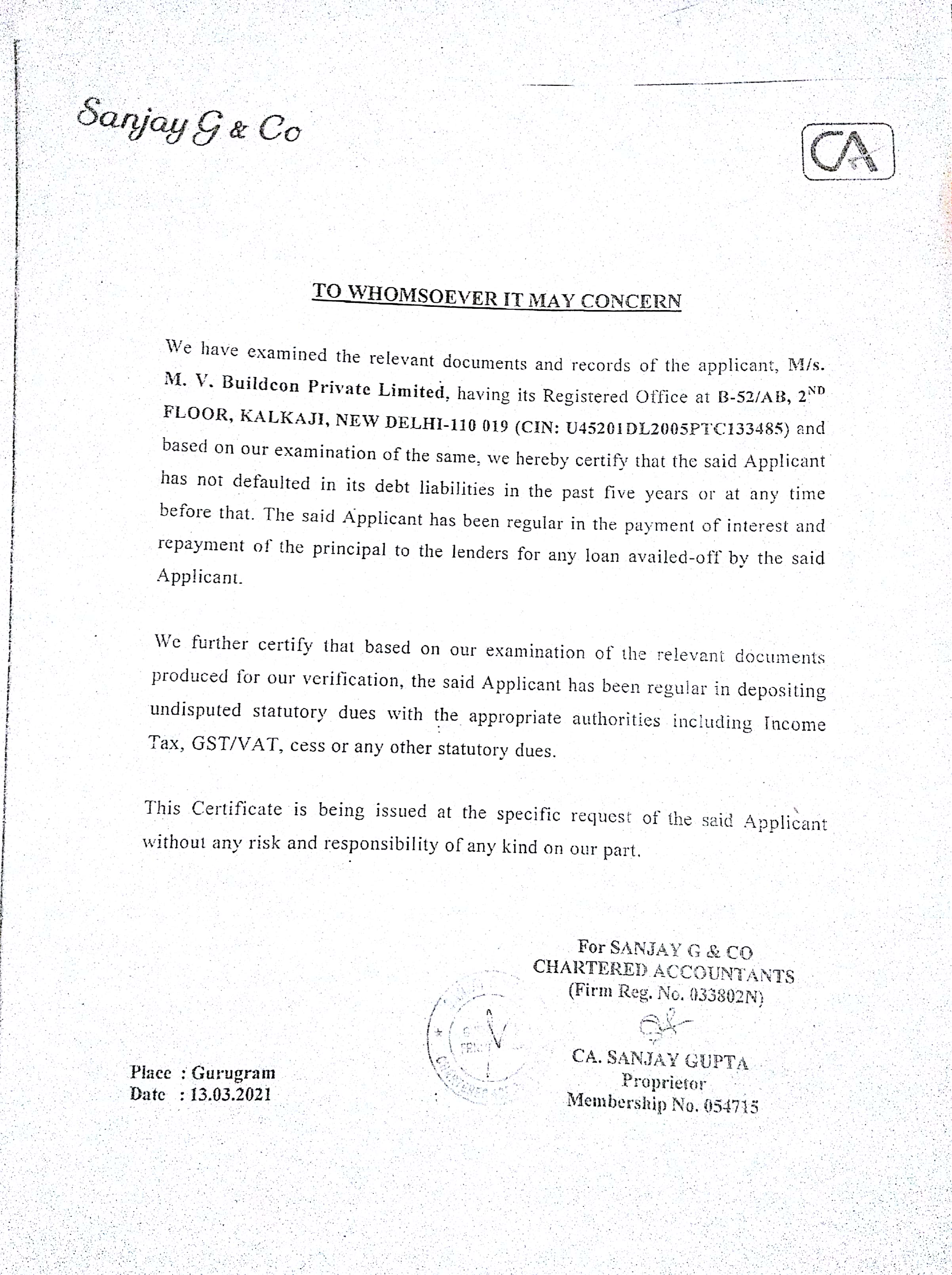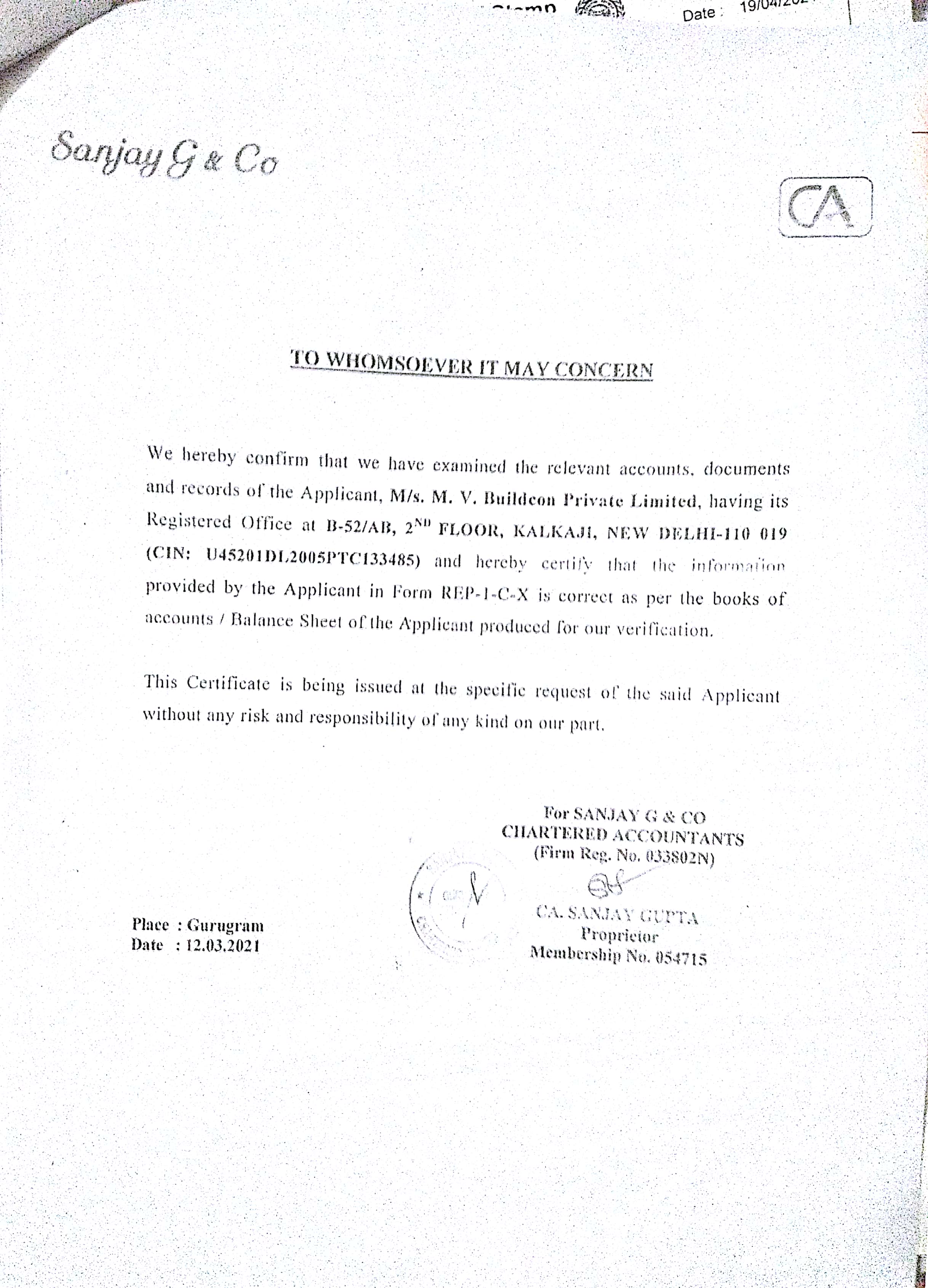 CERTIFICATE FROM A CHARTERED ACCOUNTANT CERTIFYING THAT THE INFORMSTION PROVIDED BY THE APPLICANT IN FORM REP-1-C-X IS CORRECT AS PER THE BOOKS OF ACCOUNTS/ BALANCE SHEET OF THE APPLICANT