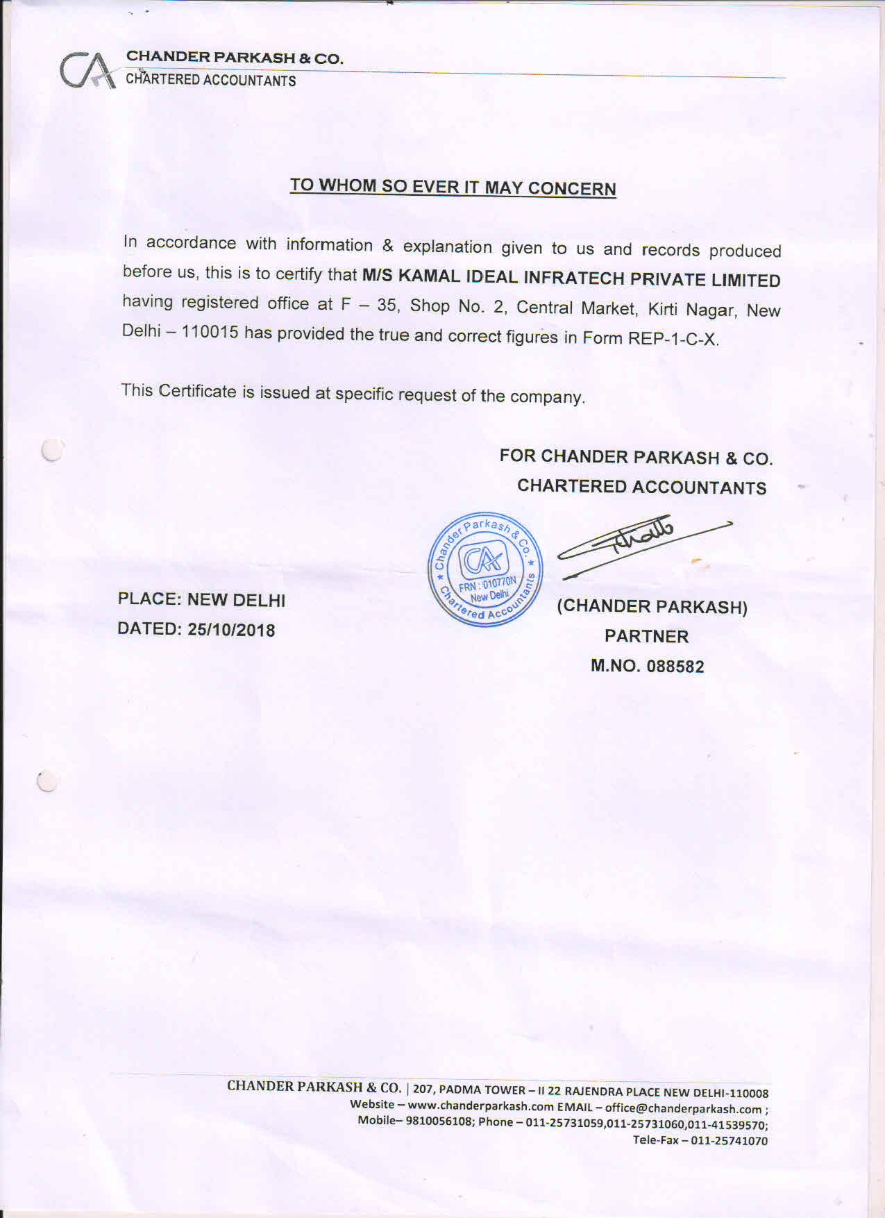 CERTIFICATE FROM A CHARTERED ACCOUNTANT CERTIFYING THAT THE INFORMSTION PROVIDED BY THE APPLICANT IN FORM REP-1-C-X IS CORRECT AS PER THE BOOKS OF ACCOUNTS/ BALANCE SHEET OF THE APPLICANT