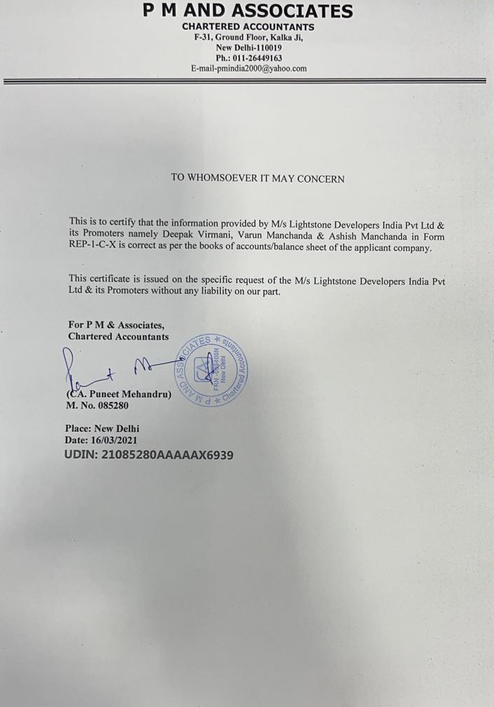 CERTIFICATE FROM A CHARTERED ACCOUNTANT CERTIFYING THAT THE INFORMSTION PROVIDED BY THE APPLICANT IN FORM REP-1-C-X IS CORRECT AS PER THE BOOKS OF ACCOUNTS/ BALANCE SHEET OF THE APPLICANT