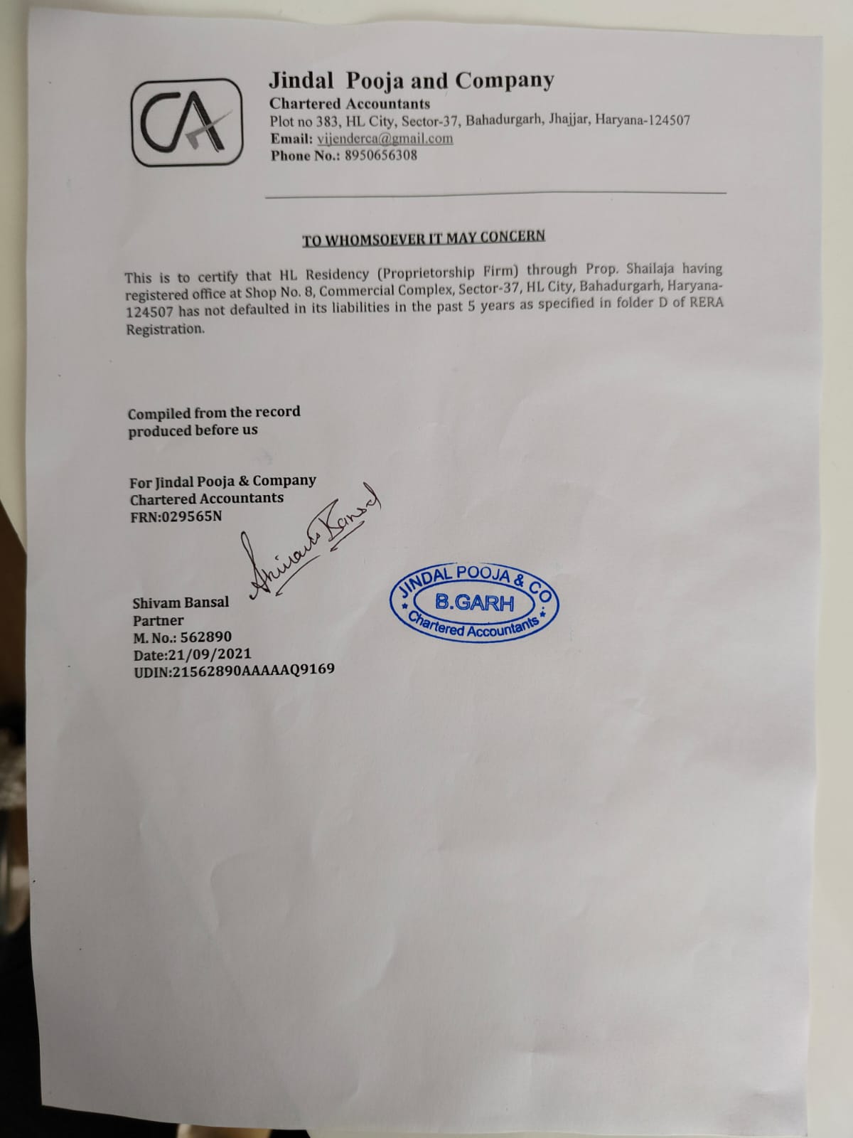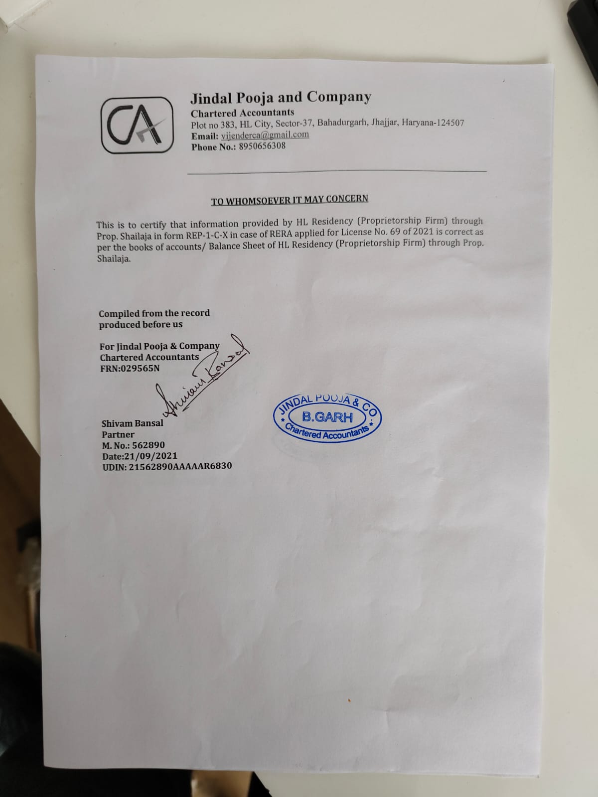 CERTIFICATE FROM A CHARTERED ACCOUNTANT CERTIFYING THAT THE INFORMSTION PROVIDED BY THE APPLICANT IN FORM REP-1-C-X IS CORRECT AS PER THE BOOKS OF ACCOUNTS/ BALANCE SHEET OF THE APPLICANT