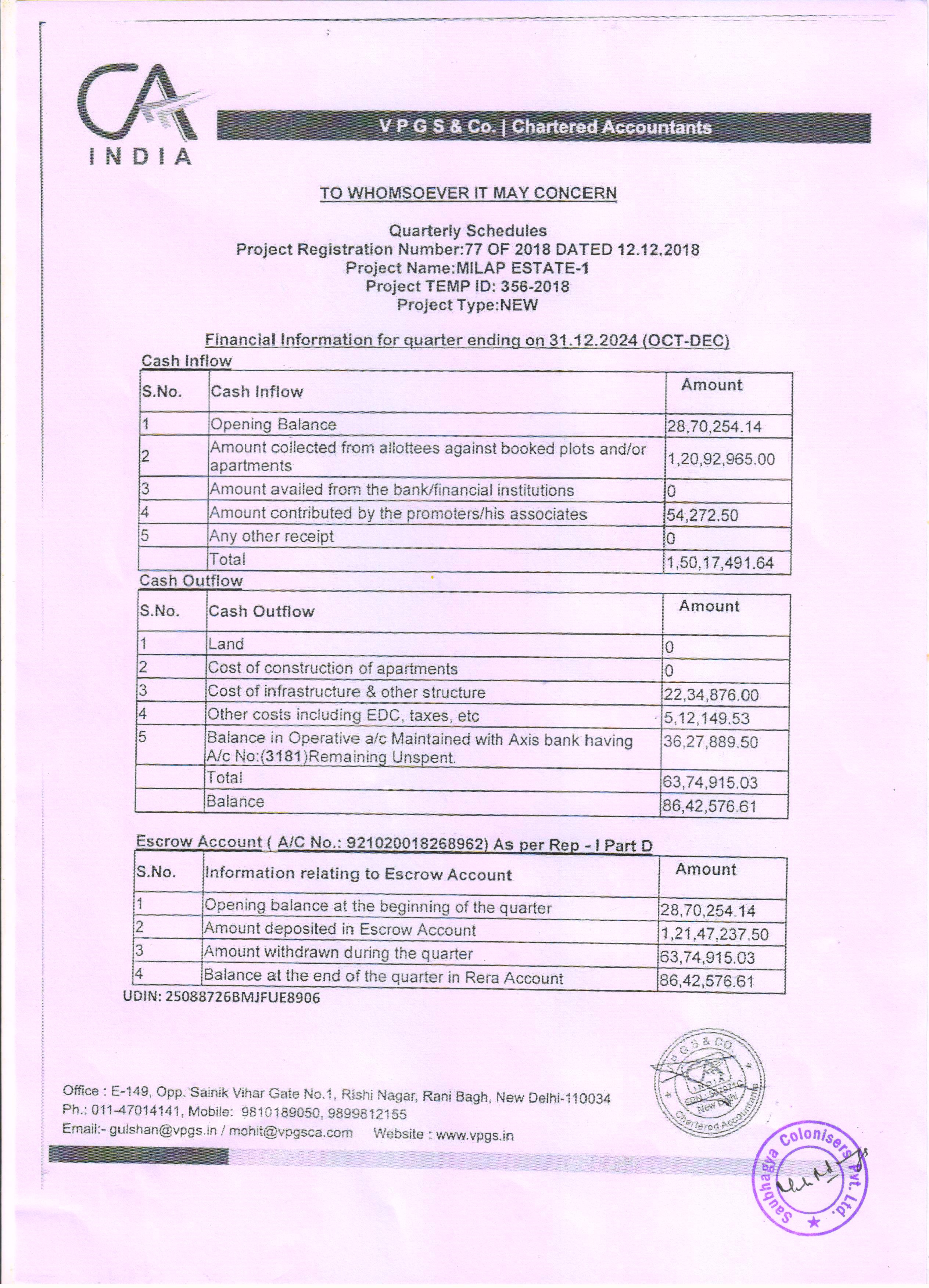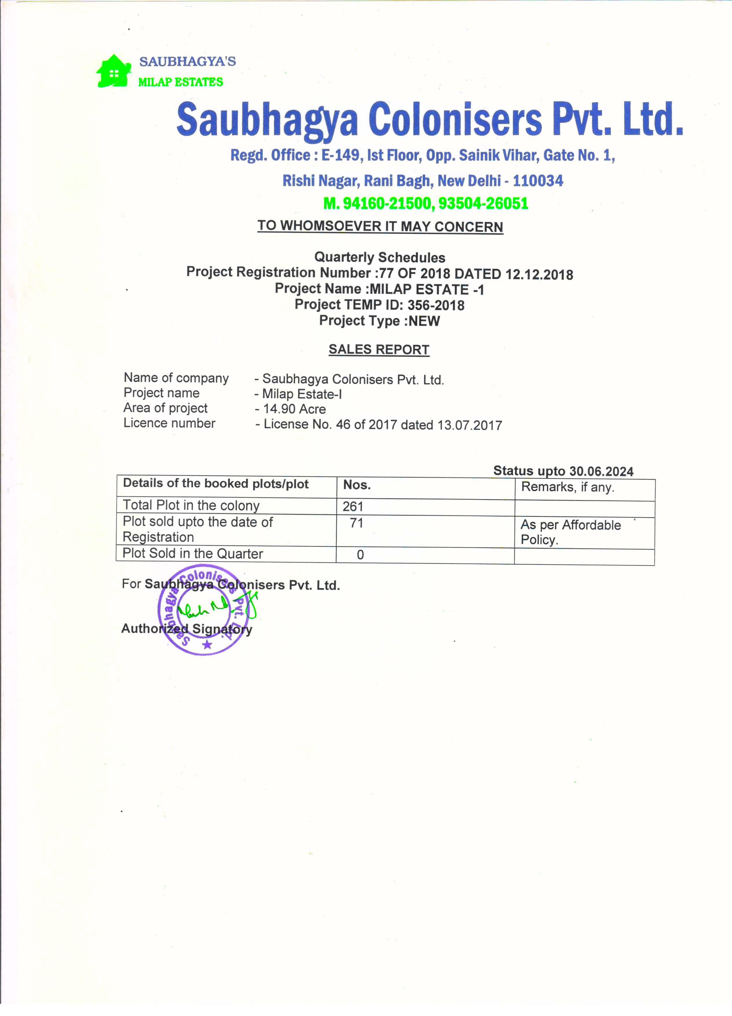 | 2 | Amount collected from allottees against booked plots and/or apartments | 0 |